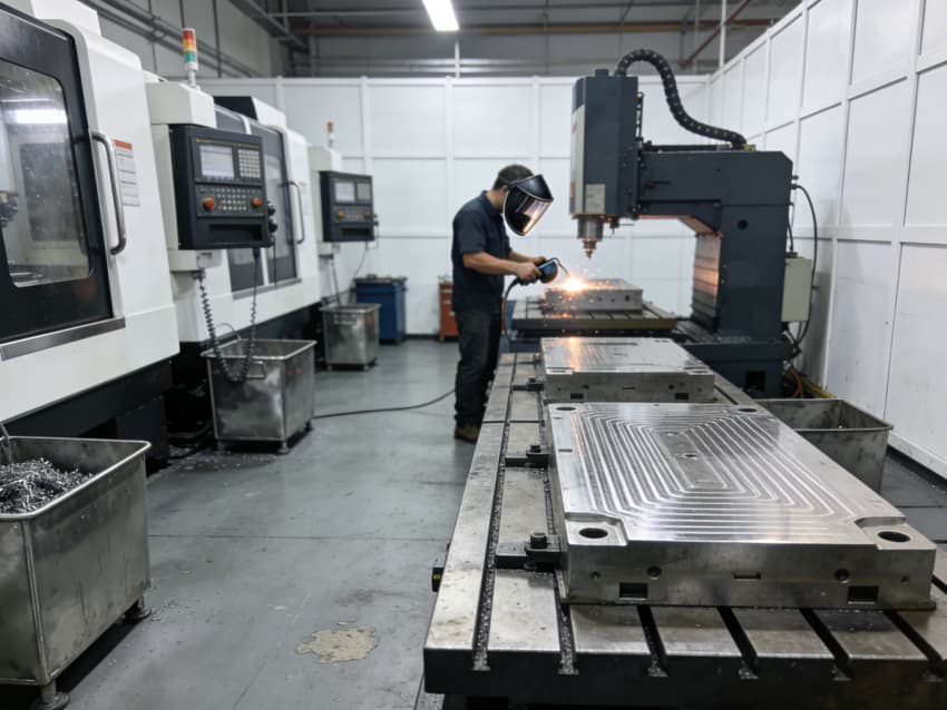 本廠房是一座集精密加工、質(zhì)量檢測(cè)、智能倉(cāng)儲(chǔ)與設(shè)備運(yùn)維于一體的現(xiàn)代化生產(chǎn)基地,廠房核心加工區(qū)排布著多臺(tái)進(jìn)口 CNC 加工中心,采用多軸聯(lián)動(dòng)控制系統(tǒng),可實(shí)現(xiàn)復(fù)雜曲面、精密孔系的一體化加工,滿足微米級(jí)精度要求;一旁的特種加工工位上,技術(shù)人員正在進(jìn)行模具表面的精密焊接與打磨,為高難度工裝件提供定制化工藝支持。