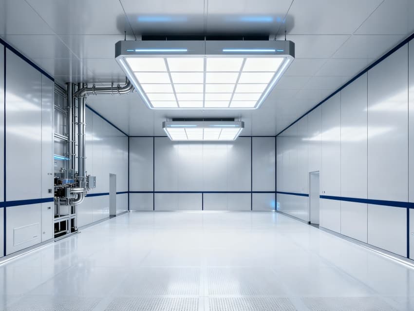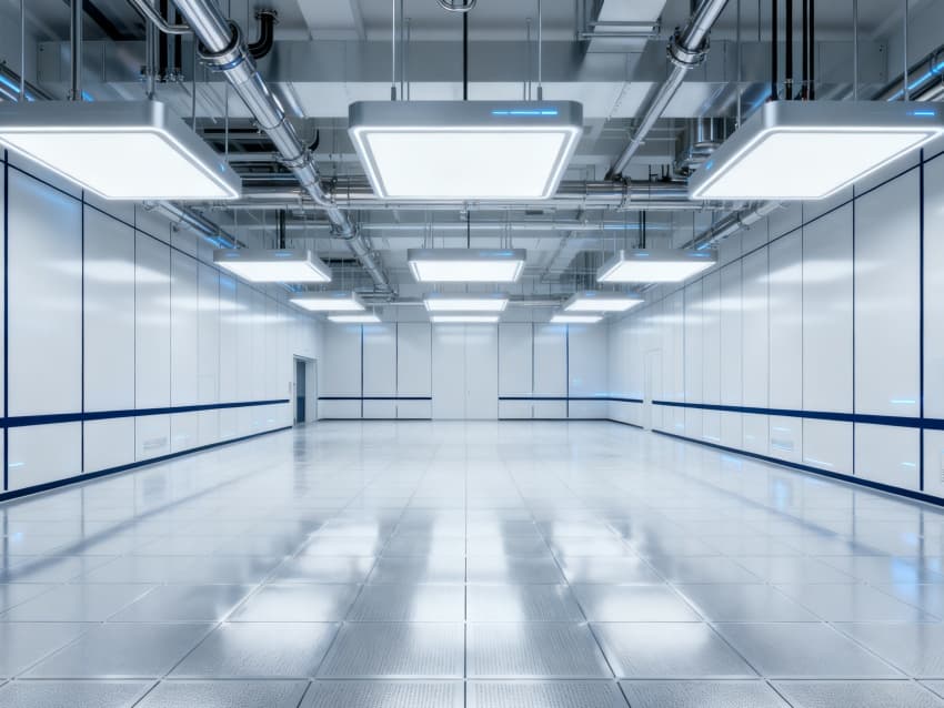 內部6個量子車間均為無設備空曠布局,按千級潔凈標準與防電磁干擾要求建設:地面鋪設防靜電環氧自流平,墻面采用無磁不銹鋼潔凈板,陰陽角做R50圓弧處理;柱網間距設為8米,預留充足設備安裝與運維空間;頂部整合恒溫恒濕系統、高效送風口及防眩光LED照明,設備管線暗藏設計,進一步強化空間空曠感,為量子芯片測試、量子傳感研發等場景提供穩定、潔凈的專屬環境。