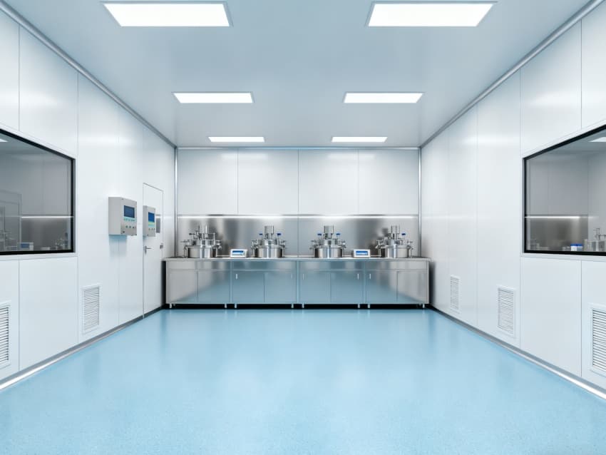在環境控制層面,本設計彰顯卓越優勢:地面選用淺藍色防滑防腐蝕環氧材料,不僅具備優異的抗藥劑侵蝕性能,而且清潔消毒極為便捷;四周白色抗菌墻面采用圓弧轉角工藝,有效規避粉塵積聚風險,搭配全吊頂潔凈送風系統,可將潔凈度穩定維持在萬級標準,精準契合藥劑生產對微環境的嚴苛需求。?